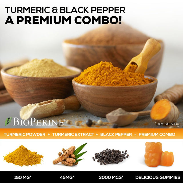 • With Black Pepper for Absorption: black pepper extract and ginger has been shown to improve the absorption of many herbs and spices; and provides as much as 2000x better absorption than consuming normal turmeric gummies alone