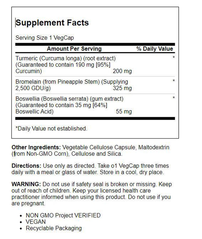 Take one capsule up to three times daily with a meal or glass of water.This one daily formula is a convenient alternative to our highly popular Guaranteed Potency Turmeric Extract line.Turmeric (curcuma longa) (root extract) (Guaranteed 190 mg 95% curcumins) 200mg * Bromelain (from pineapple stern) (Supplying 2500 GDU/g 325mg * Boswellia (Boswellia serrata) (gum extract) (Guaranteed 32.5 mg 65% boswellic acid) 50mg .