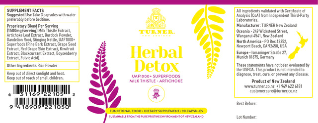 TURNER Herbal Detox cleanses the entire cellular system to enhance mental clarity and physical strength, boost energy, aid weight loss, promote skin health and provide an improved overall sense of well-being. This liver support supplement is free of yeast, corn, nuts, wheat, soy, gluten, genetically modified organisms (GMOs), mercury, other heavy metals, PCB, synthetic preservatives and auxiliary magnesium stearate. We harvest our ingredients exclusively from the pure and pristine environment of New Zealand, far removed from the industrialized world, and free of any contaminants. The source and quality of your food is a leading factor in enjoying your life and achieving your goals. Our milk thistle powder is scientifically formulated with powerful, detoxifying, mineral-rich New Zealand Wakame seaweed, herbs, enzymes, and botanicals found in nature to remove toxins from your cells, kidneys, and liver to help them perform at their optimum biological capacity.