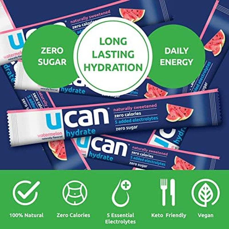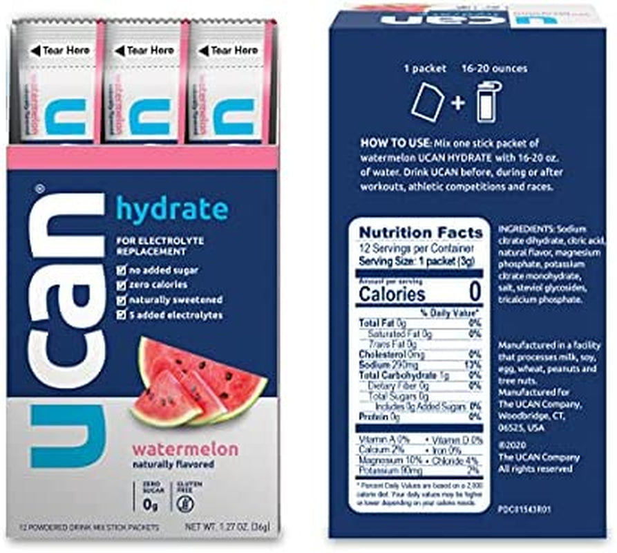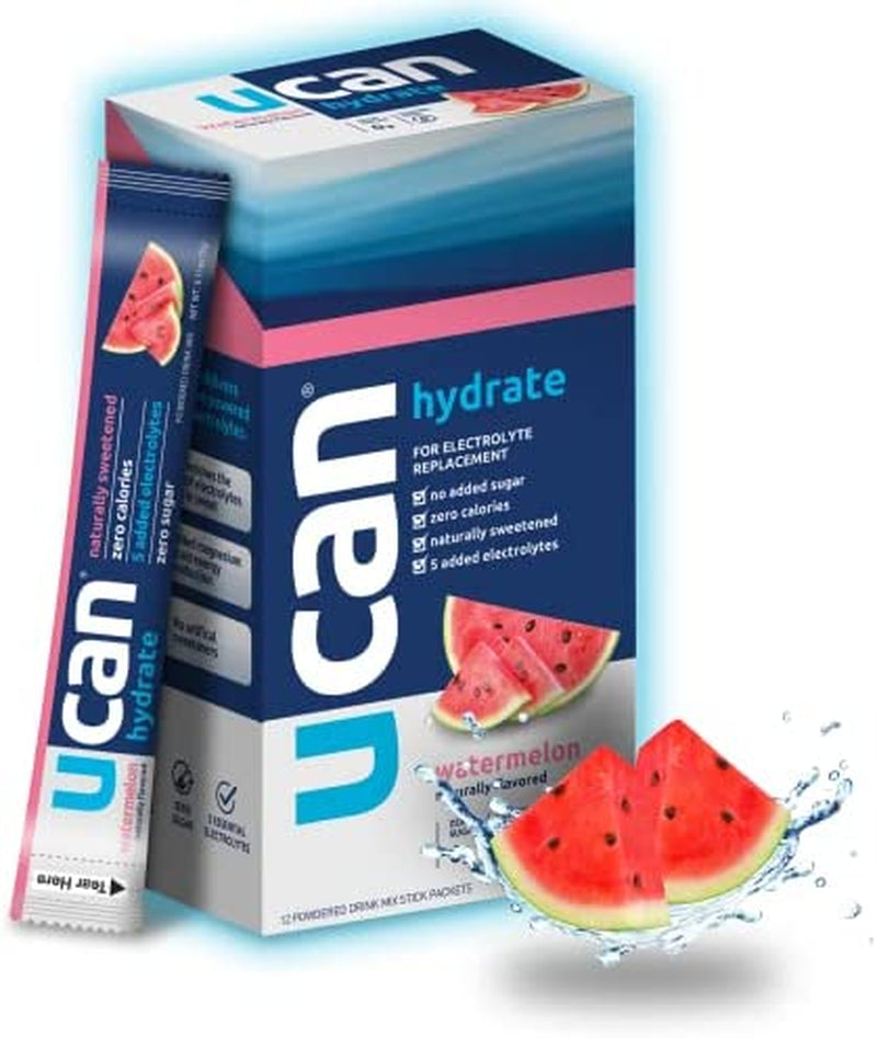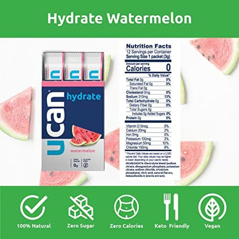 UCAN Hydrate Packets, Watermelon, 12 Count (1.27 Ounce), Keto, Sugar-Free Electrolyte Replacement for Men & Women, Non-Gmo, Vegan, Gluten-Free, Great for Runners, Gym-Goers, High Performance Athletes