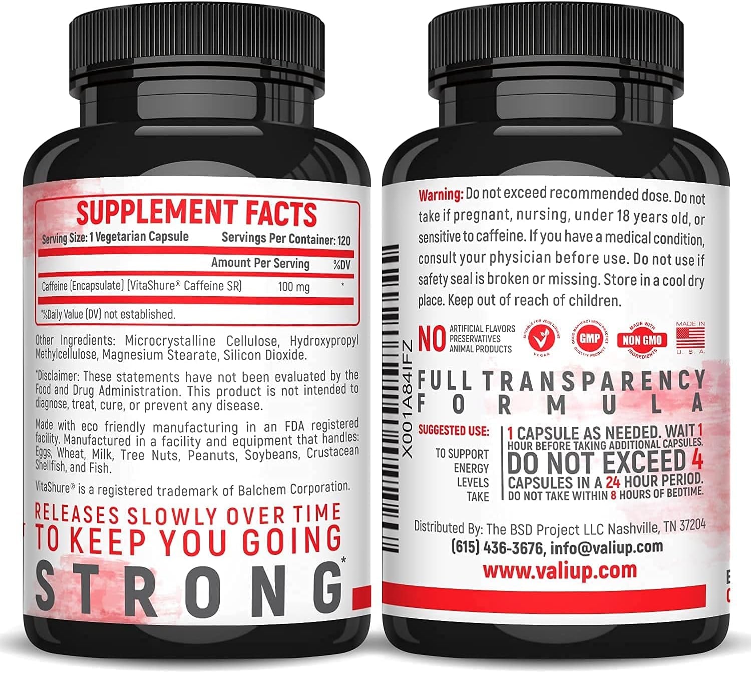 - Fast Energy, Lasts For Hours - This isn’t your normal 100mg caffeine pill. If you open up the clear capsules, you’ll see fine powder that looks like every other caffeine anhydrous supplement. But it’s not. Our caffeine is ultra premium trademarked VitaShure Caffeine SR, which is advanced micro encapsulation extended release. The genius of science creates this smart controlled delivery and is absorbed over hours of time for a smooth, long, no crash boost. See our Amazon images to learn more.