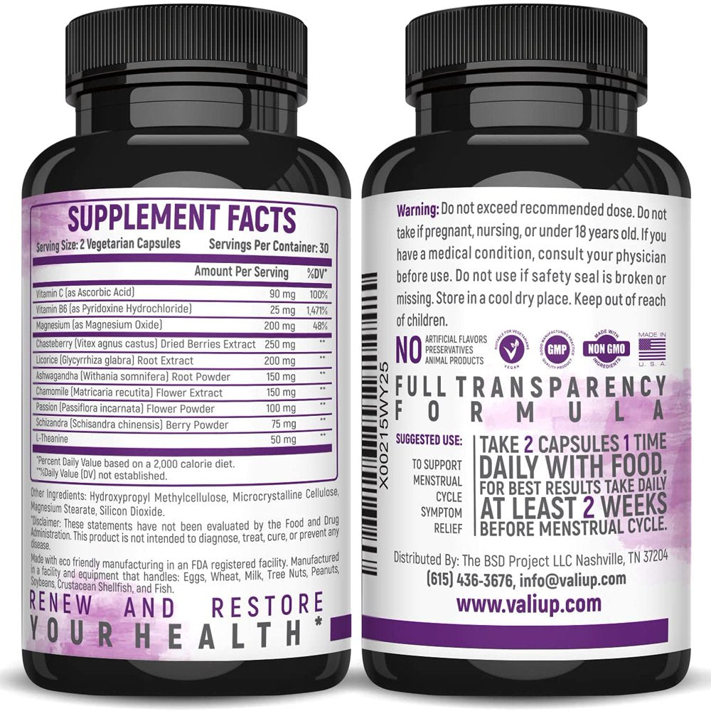 - Trusted Ingredients - Scientifically formulated with the highest quality ingredients that function to give you fast, maximum strength PMS support, and the vital natural hormonal balance that aligns with a woman’s body sensitivity and essential nature, there’s nothing proprietary or secret in the formula. Renew contains Vitamin C & B6, Magnesium, L-Theanine, Schizandra Berry, Passion Flower Powder, Chamomile Extract, Ashwagandha Root, Licorice Root, and Chasteberry Berries (Vitex angus castus).