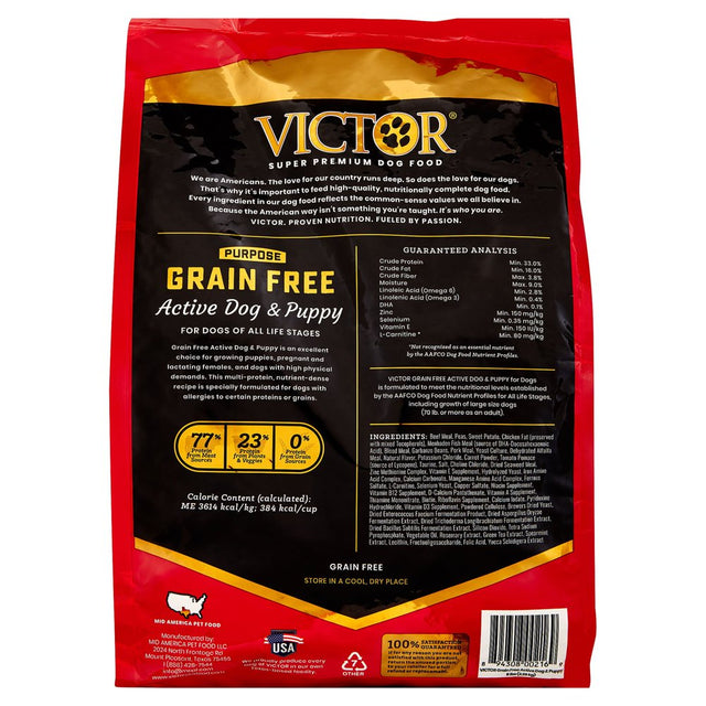 - Victor active dog and puppy formula dry dog food is a grain-free and gluten-free dog food formulated with advanced ingredients to support long term digestive and immune health for dogs in all stages of life. This super premium protein blend is made from USA sourced beef, chicken, pork and fish. Peas and sweet potatoes make up the bulk of the carbohydrates. It is great for active dogs and puppies. Use the table for recommended feeding amounts. Actual amounts may vary based on breed, age, weight and activity level. Increase or decrease amounts as necessary to maintain proper body condition.