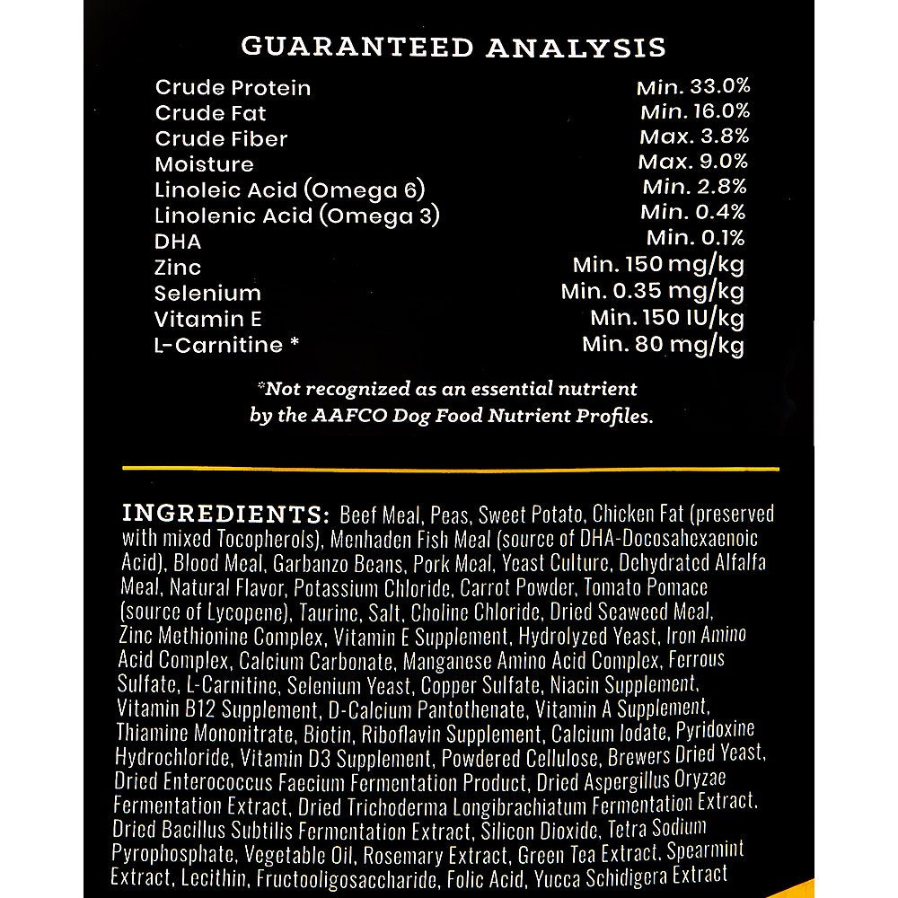 - Ingredients: Beef Meal, Sweet Potato, Chicken Meal, Peas, Chicken Fat (preserved with mixed Tocopherols), Pork Meal, Menhaden Fish Meal (source of DHA-Docosahexaenoic Acid), Dehydrated Alfalfa Meal, Dried Egg Product, Flax Seed (source of Omega 3 Fatty Acid), Yeast Culture, Natural Chicken Flavor, Potassium Chloride, Dried Kelp, Salt, Montmorillonite, Tomato Pomace (source of Lycopene), Dried Carrot, Choline Chloride, Dried Chicory Root, Taurine, Zinc Amino Acid Complex, Hydrolyzed Yeast, Vitamin E Supplement, Iron Amino Acid Complex, Manganese Amino Acid Complex, Ferrous Sulfate, Zinc Sulfate, Selenium Yeast, L-Carnitine, Vitamin A Supplement, Vitamin D Supplement, Copper Sulfate, Vitamin B-12 Supplement, Niacin Supplement, D-Calcium Pantothenate, Thiamine Mononitrate, Biotin, Magnesium Amino Acid Chelate, Riboflavin Supplement, Calcium Iodate, Pyridoxine Hydrochloride, Lecithin, Fructooligosaccharide, Folic Acid, Yeast Extract, Dried Enterococcus Faecium Fermentation Product, Dried Lactobacillus Acidophilus Fermentation Product, Dried Aspergillus Niger Fermentation Product, Dried Bacillus Subtilis Fermentation Product, Yucca Schidigera Extract, Citric Acid, Rosemary Extract.