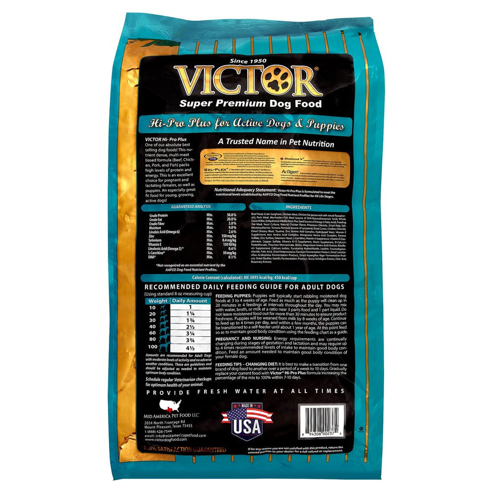 - FROM PUPPY TO ADULT: Suitable for all life stages, this premium dog food is ideal for pregnant dogs, lactating females and puppies; VICTOR Hi-Pro Plus for Dogs is formulated to meet the nutritional levels established by the AAFCO Dog Food Nutrient Profiles for All Life Stages, except for growth of large size dogs (70 lb. or more as an adult)