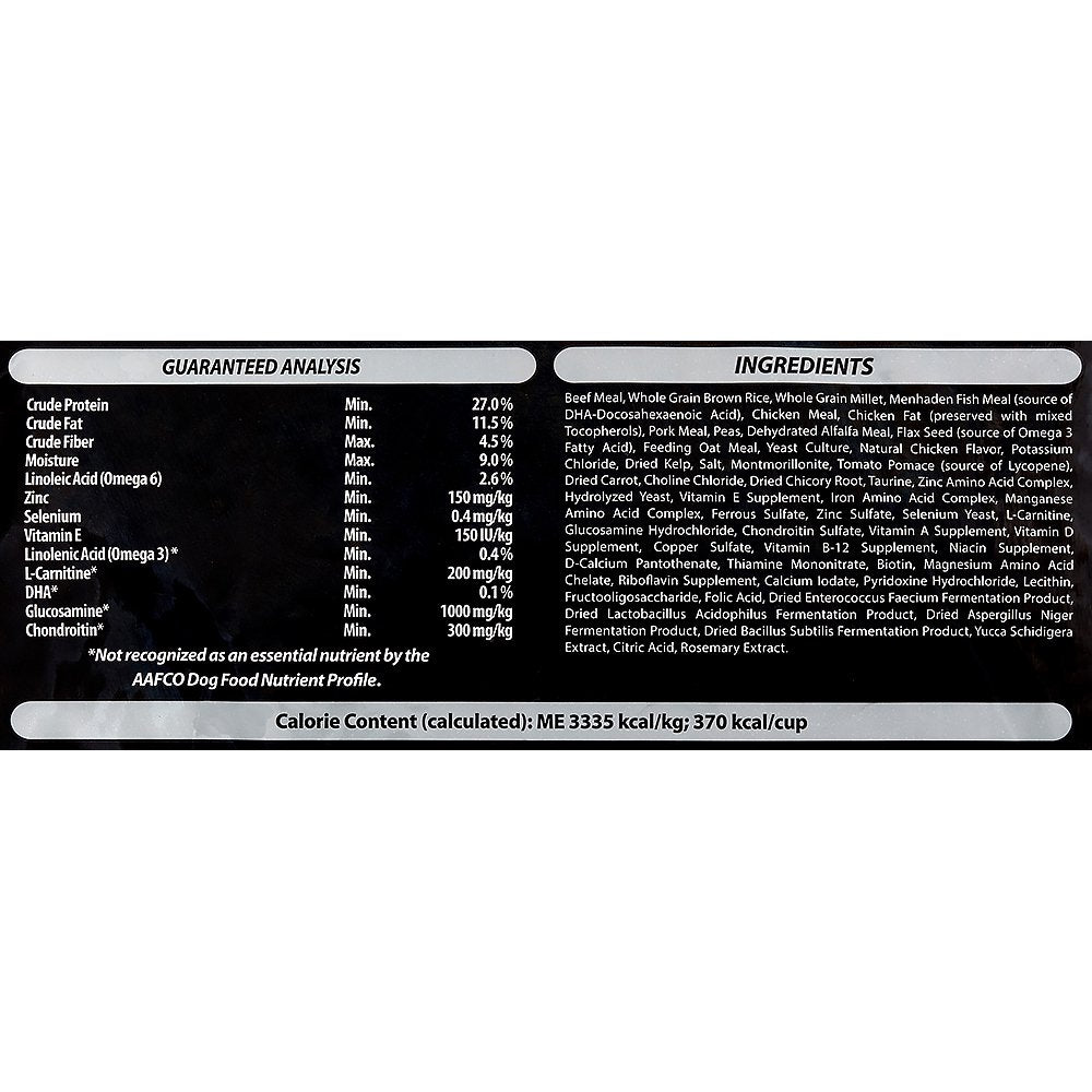 - Ingredients: Beef Meal, Whole Grain Brown Rice, Whole Grain Millet, Menhaden Fish Meal (source of DHA-Docosahexaenoic Acid), Chicken Meal, Chicken Fat (preserved with mixed Tocopherols), Pork Meal, Peas, Dehydrated Alfalfa Meal, Flax Seed (source of Omega 3 Fatty Acid), Feeding Oat Meal, Yeast Culture, Natural Chicken Flavor, Potassium Chloride, Dried Kelp, Salt, Montmorillonite, Tomato Pomace (source of Lycopene), Dried Carrot, Choline Chloride, Dried Chicory Root, Taurine, Zinc Amino Acid Complex, Hydrolyzed Yeast, Vitamin E Supplement, Iron Amino Acid Complex, Manganese Amino Acid Complex, Ferrous Sulfate, Zinc Sulfate, Selenium Yeast, L-Carnitine, Glucosamine Hydrochloride, Chondroitin Sulfate, Vitamin A Supplement, Vitamin D Supplement, Copper Sulfate, Vitamin B-12 Supplement, Niacin Supplement, D-Calcium Pantothenate, Thiamine Mononitrate, Biotin, Magnesium Amino Acid Chelate, Riboflavin Supplement, Calcium Iodate, Pyridoxine Hydrochloride, Lecithin, Fructooligosaccharide, Folic Acid, Dried Enterococcus Faecium Fermentation Product, Dried Lactobacillus Acidophilus Fermentation Product, Dried Aspergillus Niger Fermentation Product, Dried Bacillus Subtilis Fermentation Product, Yucca Schidigera Extract, Citric Acid, Rosemary Extract.