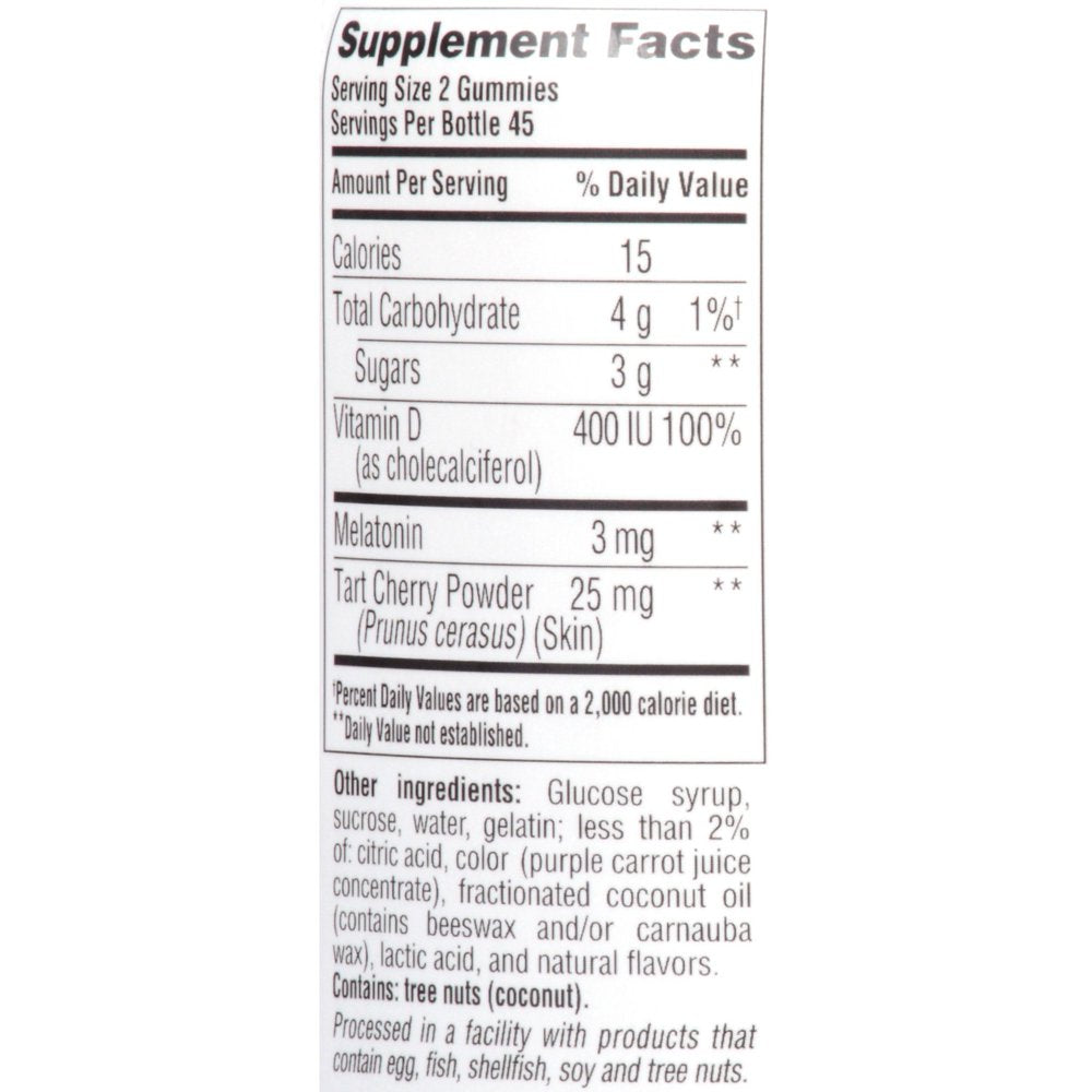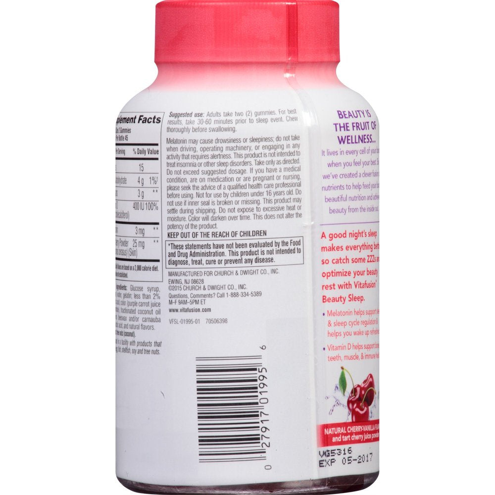 Details: Get the assistance you need to fall asleep faster and get a good night's rest with the vitafusion Beauty Sleep Melatonin Gummy Supplement 90-count bottle. Beauty is the fruit of wellness. It lives in every cell of your body when you feel your best. These gluten-free nutritional supplements contain a clever fusion of nutrients to help feed your body the nutrition it needs to achieve beauty from the inside out. This dietary supplement melatonin dose provides 5 mg per serving to help induce natural sleep; plus Vitamin D for bone health. vitafusion Beauty Sleep Gummies come in a Natural Berry flavor. These melatonin vitamin gummies are easy-to-take sleep vitamins. Look for our melatonin gummies for kids. They have no artificial colors or flavors; no artificial sweetener; no high-fructose corn syrup and are dairy- and gluten-free. #1 Adult Gummy Vitamin Brand Supports sleep awaking refreshed* 3 mg Melatonin; plus 400 IU Vitamin D Natural cherry-vanilla flavor *These statements have not been evaluated by the Food and Drug Administration. This product is not intended to diagnose; treat; cure or prevent any disease.