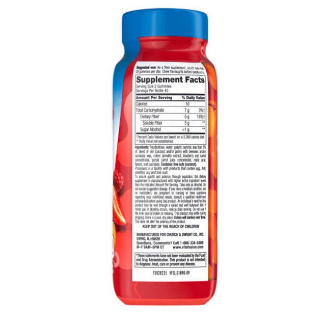 Vitafusion Fiber Well Sugar Free Fiber Supplement Gummies are digestive support supplements that help you get the fiber you may need (1). Each delicious two-gummy serving provides a great-tasting and convenient alternative to traditional fiber supplements that may require mixing or measuring. Vitafusion believes that taste and nutrition can be fused together, ensuring that taking your dietary supplements is an easy and delicious part of your day. These sugar free fiber gummies provide 5 grams of prebiotic Fiber in each serving to aid digestive health and support regularity (1). Vitafusion fiber gummies for adults are made with no high-fructose corn syrup, no gluten and no synthetic FD&C dyes. The 90-count bottle ensures you’ll have enough fiber gummies to last you 45 days. Vitafusion is the only vitamin gummy brand with products that have been awarded the ChefsBest Excellence award for taste; these fiber gummies were the recipient of the 2018 ChefsBest Excellence Award (2). Take a fruitful step toward a healthier, happier world with America’s #1 Gummy Vitamin Brand.(1) These statements have not been evaluated by the Food and Drug Administration. This product is not intended to diagnose, treat, cure or prevent any disease. (2) The ChefsBest Excellence Award is awarded to brands that surpass quality standards established by independent professional chefs. Evaluation funded by Church & Dwight Co., Inc. One 90 count bottle of vitafusion Fiber Well Sugar Free Fiber Supplement Gummies, enough fiber dietary supplements for 45 days Dietary supplement gummies contain prebiotic Fiber to help aid digestive health and support regularity (1) Digestive support fiber supplements contain 5 grams of prebiotic Fiber in each two-gummy serving (1) Convenient fiber gummies have a chewy texture that makes a great alternative to traditional fiber and prebiotic supplement pills and powders Peach, strawberry and berry-flavored fiber gummies offer delicious, natural fruit flavors in every bite Sugar free fiber gummies made with no high-fructose corn syrup, no gluten and no synthetic FD&C dyes vitafusion fiber supplements were the recipient of the 2018 ChefsBest Excellence Award (2)