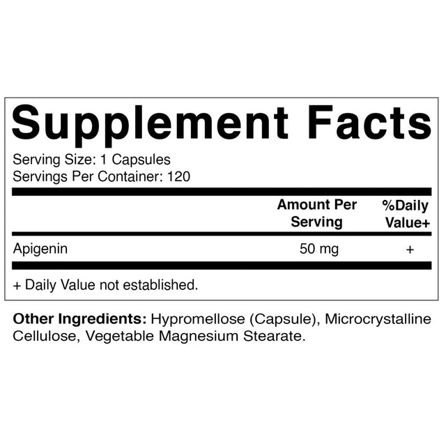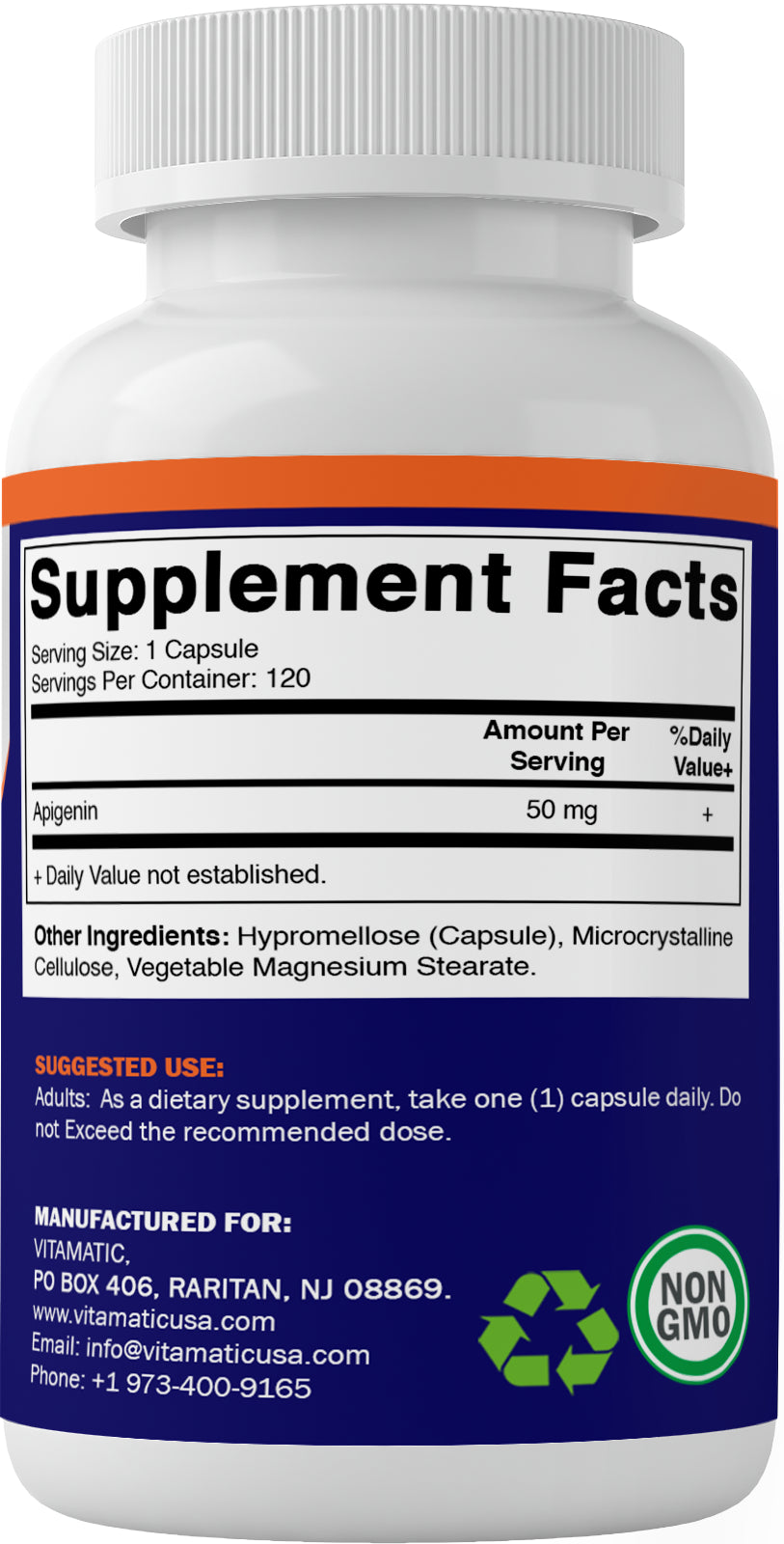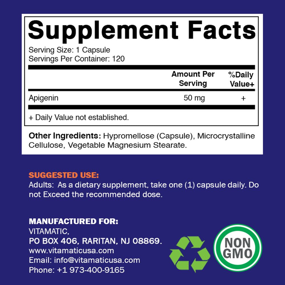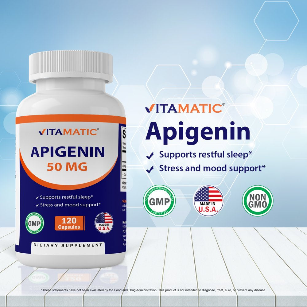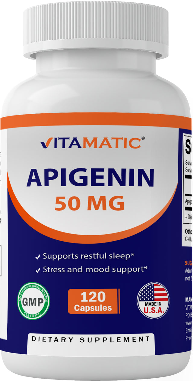 Vitamatic Apigenin 50 mg 120 Veg Capsules supports restful sleep and helps with stress and mood.