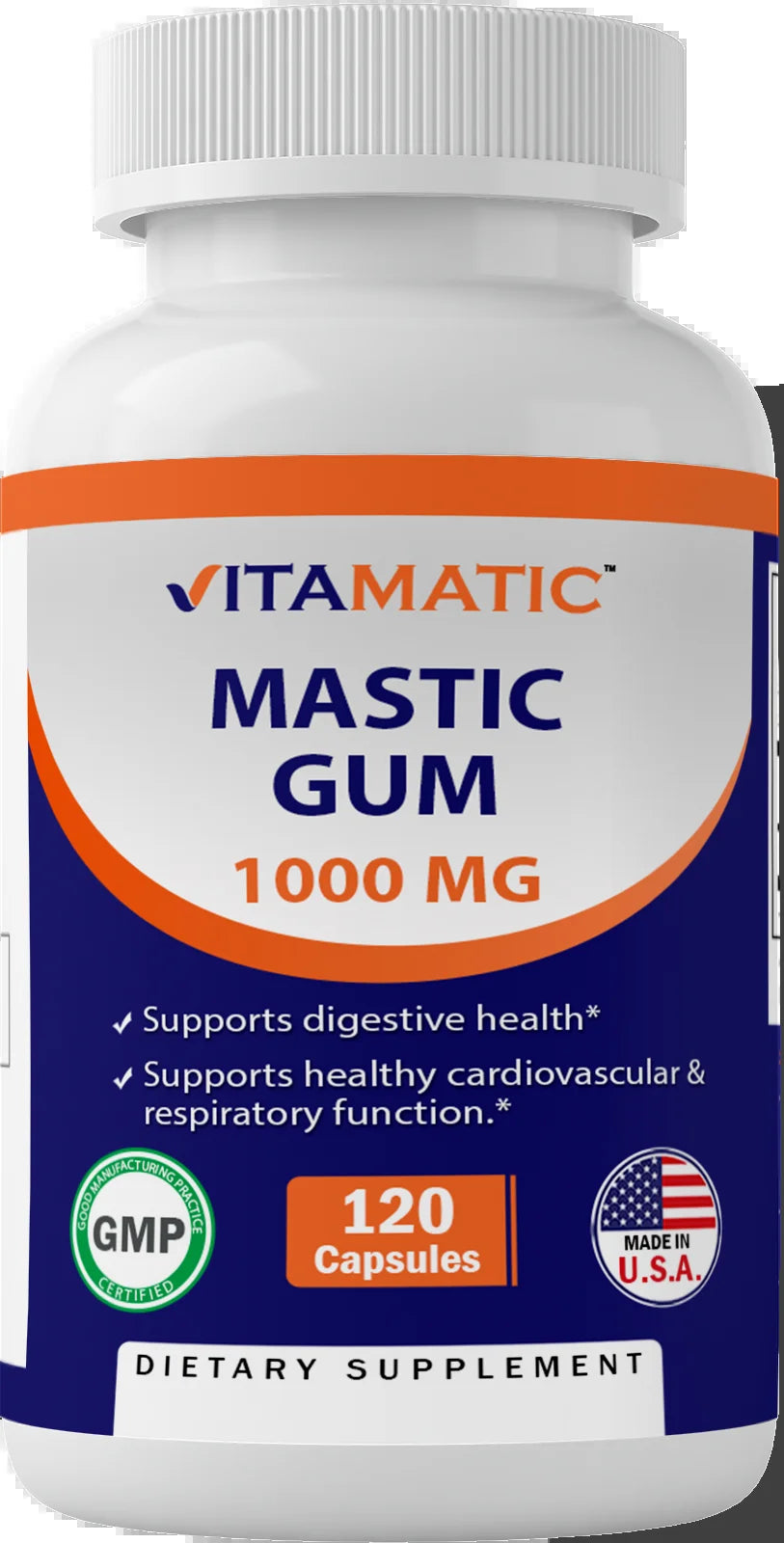 Vitamatic Mastic Gum 1000 mg per serving Support Digestive Function, Gastrointestinal Health, Immune and Oral Wellness, 120 Capsules. Mastic Gum is derived from Pistacia lentiscus. Mastic gum is a natural breath freshener. Every capsule provides an optimum dosage of 500 mg of Mastic Gum which provides many digestive & oral health benefits.* Our Mastic Gum Capsules are free of sugar, starch, soy, yeast, corn, wheat, egg, artificial color, flavor, & preservatives & Made in the USA with strict GMP Standards