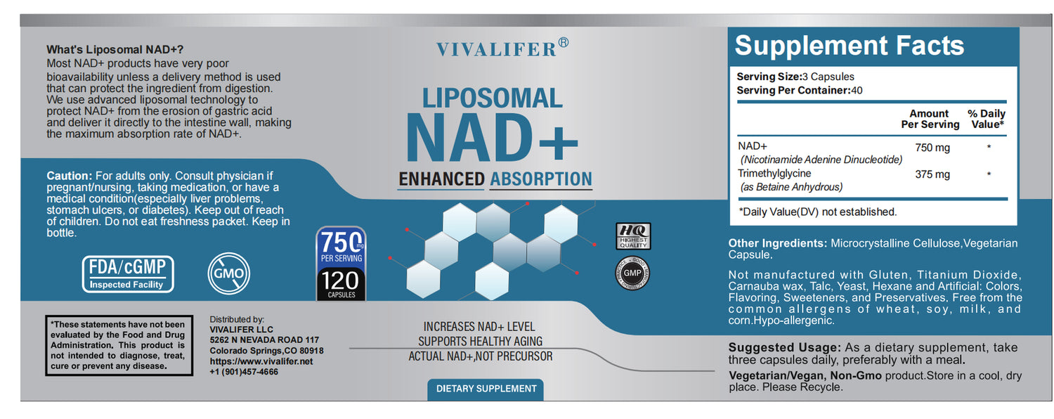 VIVALIFER Liposomal NAD+ Supplement, NAD+ 500Mg with TMG 250 Mg for Ultra Max Enhanced Absorption, Promotes Anti-Aging, Energy and DNA Repair, Brain Function - 120 Capsules