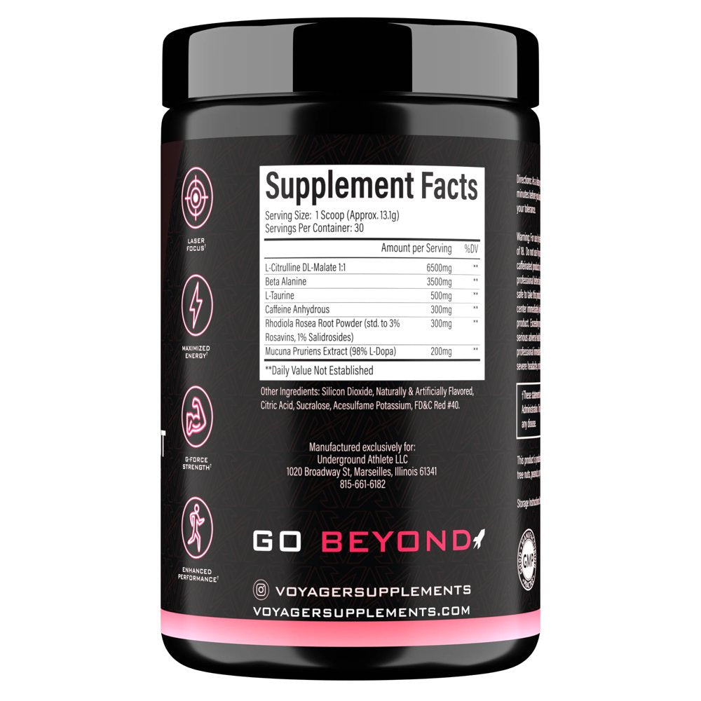 • POWERFUL PRE-WORKOUT FORMULA: Voyager Supplements Pre-Workout delivers a science-backed blend of potent ingredients designed to optimize your workout performance, including L-Citrulline, Beta-Alanine, Caffeine, Rhodiola Rosea, and Mucuna Pruriens.