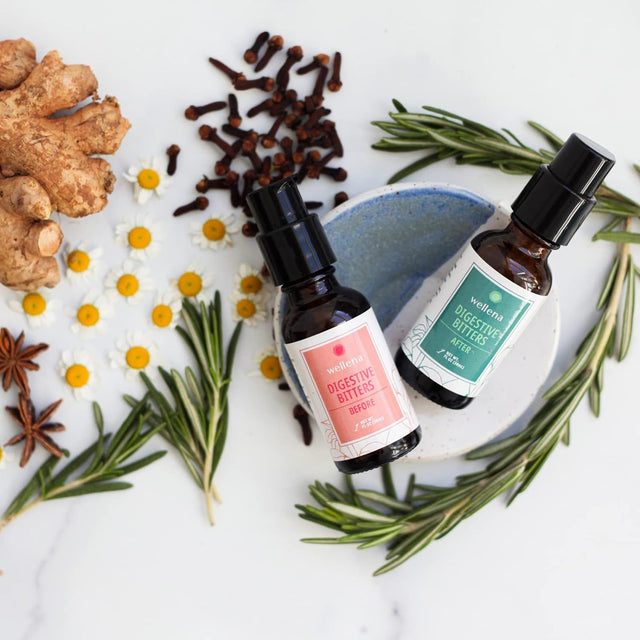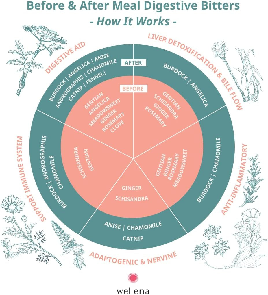 • NATURALLY SUPPORT HORMONE AND DIGESTIVE HEALTH — Wellena's Before and After Digestive Bitters offer a potent yet balanced profile of classic bitter herbs for more efficient liver detoxification, better bowel movements, less burping, less bloating, less acid reflux, and more energy.
