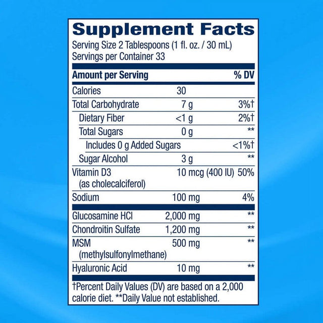 This fast absorbing berry-flavored liquid provides 2,000mg of glucosamine, a building block of cartilage tissue; 1,200mg of chondroitin, a component of connective tissue; 500mg MSM, a source of sulfur and a mineral vital in the formation of collagen; vitamin D3 to help promote healthy bones and muscle function; and 10 mg of hyaluronic acid.