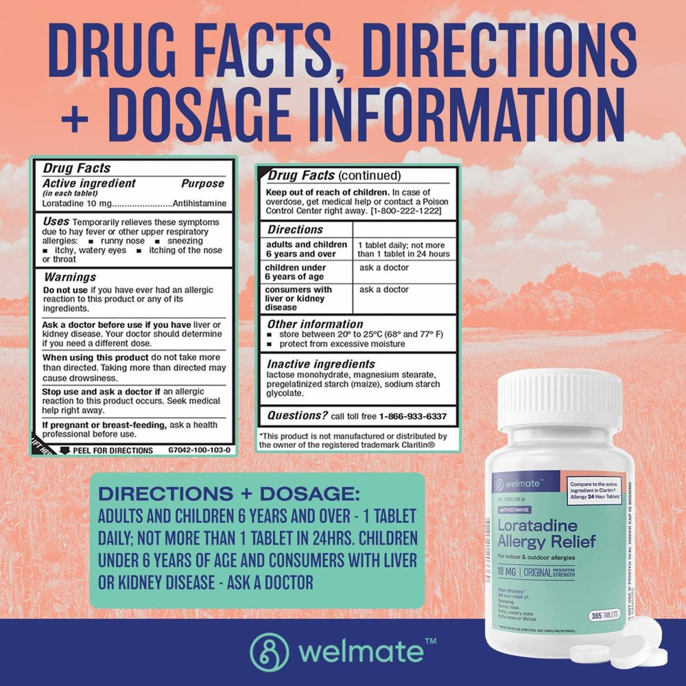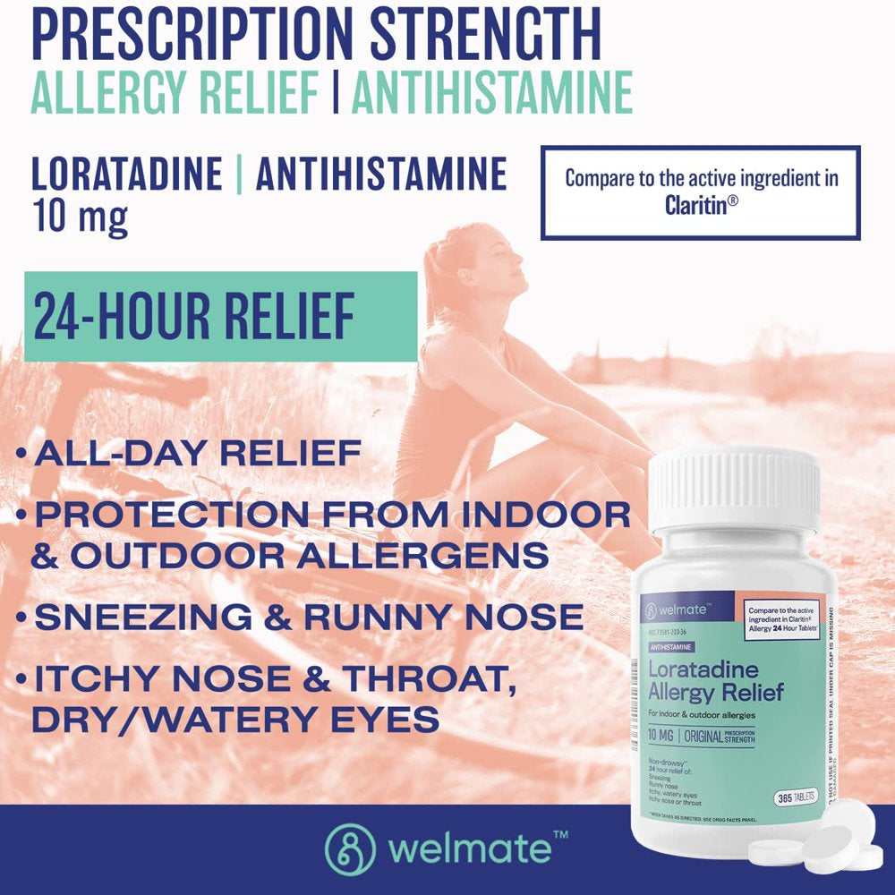 - POWERFUL ANTIHISTAMINE: Our allergy relief tablets contain Loratadine, a trusted antihistamine that effectively blocks the release of histamine, a substance in the body that triggers allergy symptoms. By inhibiting histamine, WELMATE provides fast-acting relief from seasonal allergies, hay fever, and other respiratory allergies, helping you breathe easier and enjoy your day to the fullest.