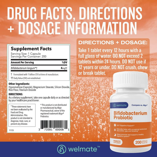 - HIGH POTENCY AND VALUE SIZE: Each bottle of Welmate Bifidobacterium Probiotic Supplement contains 200 capsules, offering a great value for long-term use. With a high potency formula, each capsule is packed with billions of live Bifidobacterium cultures to support optimal gut health.