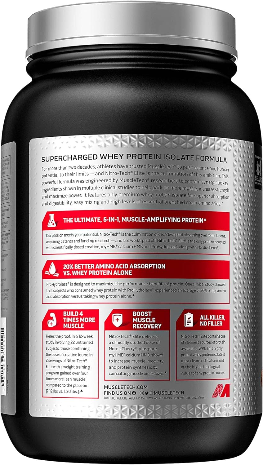 - PROTEIN POWDER for MUSCLE GAIN – In a 12-week study involving 22 subjects, those combining the dose of creatine found in 2 scoops of Nitro-Tech Elite with weight training gained over 4X more lean muscle compared to the placebo group (7.12 vs 1.30 lbs)