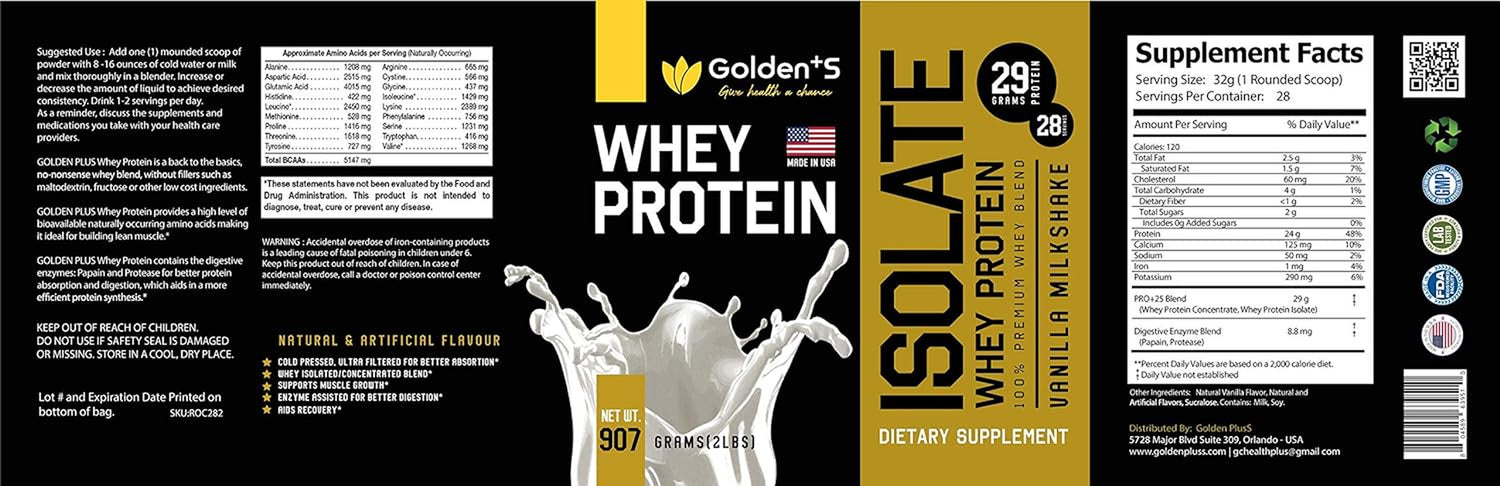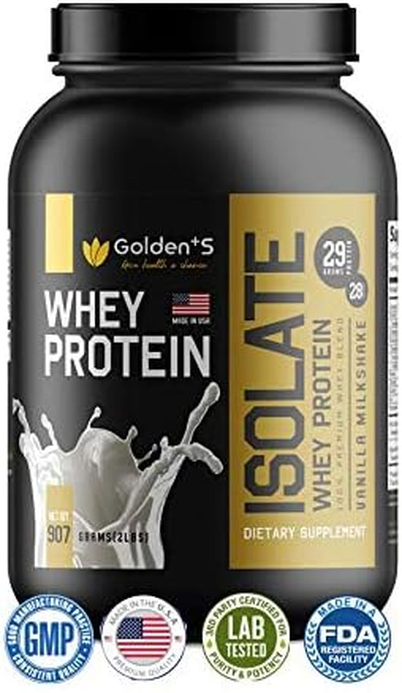 Golden Plus 100% Whey Protein Powder ISOLATE, Naturally Flavored Vanilla, 2 Pounds, 29 servings. FDA registered, GMP certified.