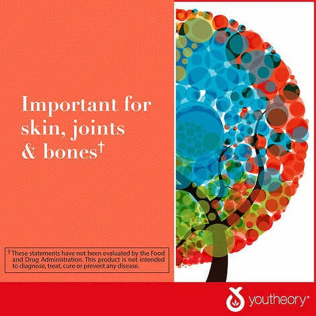 Youtheory® Collagen Advanced Formula delivers 6 grams (6,000 mg) of hydrolyzed collagen per serving, plus a daily supply of Vitamin C, to help combat age-related collagen loss. Collagen is the most abundant protein in the human body1 and a key constituent of skin, joints, bones, blood vessels, organs and more. The word “collagen" is derived from kolla, the Greek word for glue. Collagen is literally the substance that binds us together. It forms an extensive netlike framework throughout the inner body and imparts shape and structural strength to virtually every tissue. While bountiful in youth, the collagen content of the body gradually decreases with age, leading to thinner, weaker, less resilient tissues over time.2 Loss of collagen is one of the most profound consequences of the aging process. One of the fastest and easiest ways to replenish this vital protein is to supplement your diet with hydrolyzed collagen. Hydrolyzed collagen is a special type of protein that is “pre-digested” or broken down into smaller peptides for enhanced absorption into the body. Several studies have demonstrated that hydrolyzed collagen peptides are quickly absorbed after ingestion3 and readily deposited in the body’s tissues, where they act as building blocks and may help to trigger your body’s own internal collagen production.4