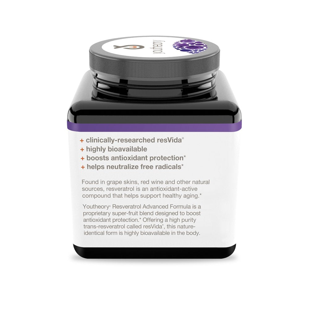 Youtheory Resveratrol Advanced Antioxidant Formula is a proprietary super-fruit blend designed to boost antioxidant protection.* Offering a high purity trans-Resveratrol called resVida®, this nature-identical form is highly bioavailable in the body. Additionally it combines multiple grape extracts from the Bordeaux region of France with Acerola Cherry and Pomegranate extracts, making a powerful blend of antioxidants to protect your health and aid you in sustaining a healthy lifestyle.