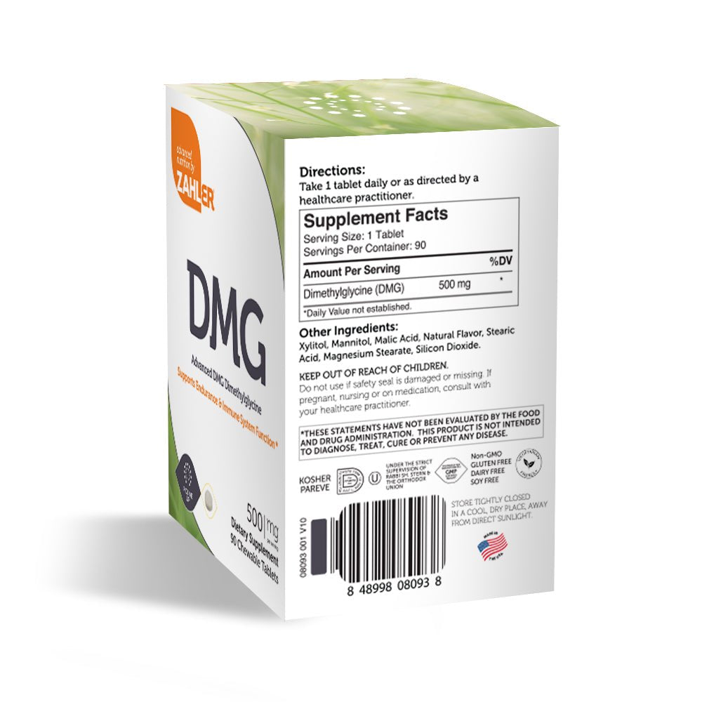 Zahler - DMG 500 mg. - 90 Chewable TabletsZahler DMG 500 mg. is found in the cells of plants and animals; humans produce the nutrient only in limited amounts. Supplementing your diet with Zahler's DMG helps the body maintain a favorable nutritional environment for your body's cell. DMG is effective in supporting immune system function and better utilization of oxygen at the cellular level.