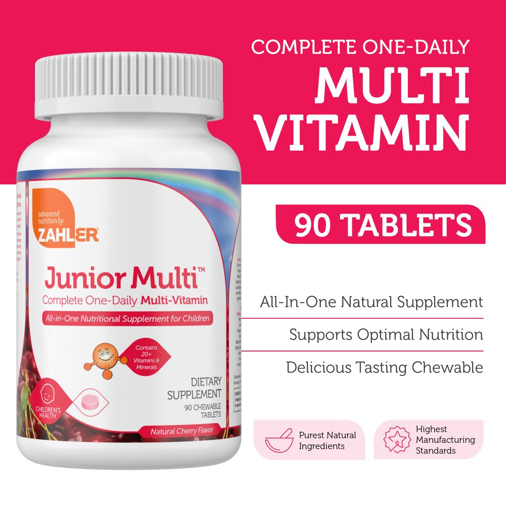 Zahler's Junior Multi is a children's multivitamin chock full of critical vitamins and minerals, recommended by today’s leading researchers, to fill in the gaps of the most prevalent nutritional deficiencies. 20+ nutrients per serving, Because nutritional deficits that occur during a child’s formative years have both immediate and lifelong consequences, Junior Multi contains the right combination of 23 essential nutrients in a delicious tasting, all natural cherry flavored tablet. It gives growing children the nutritional boost they need to maintain a healthy mind and body.