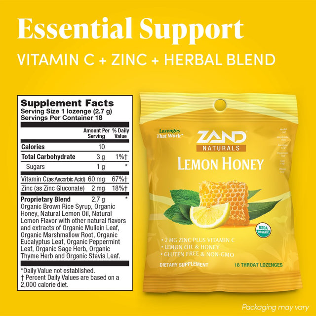 Zand Immunity Organic Lemon Honey Herbalozenge | Immune Support Throat Drops W/ Vitamin C & Zinc ('18 Count (Pack of 1))