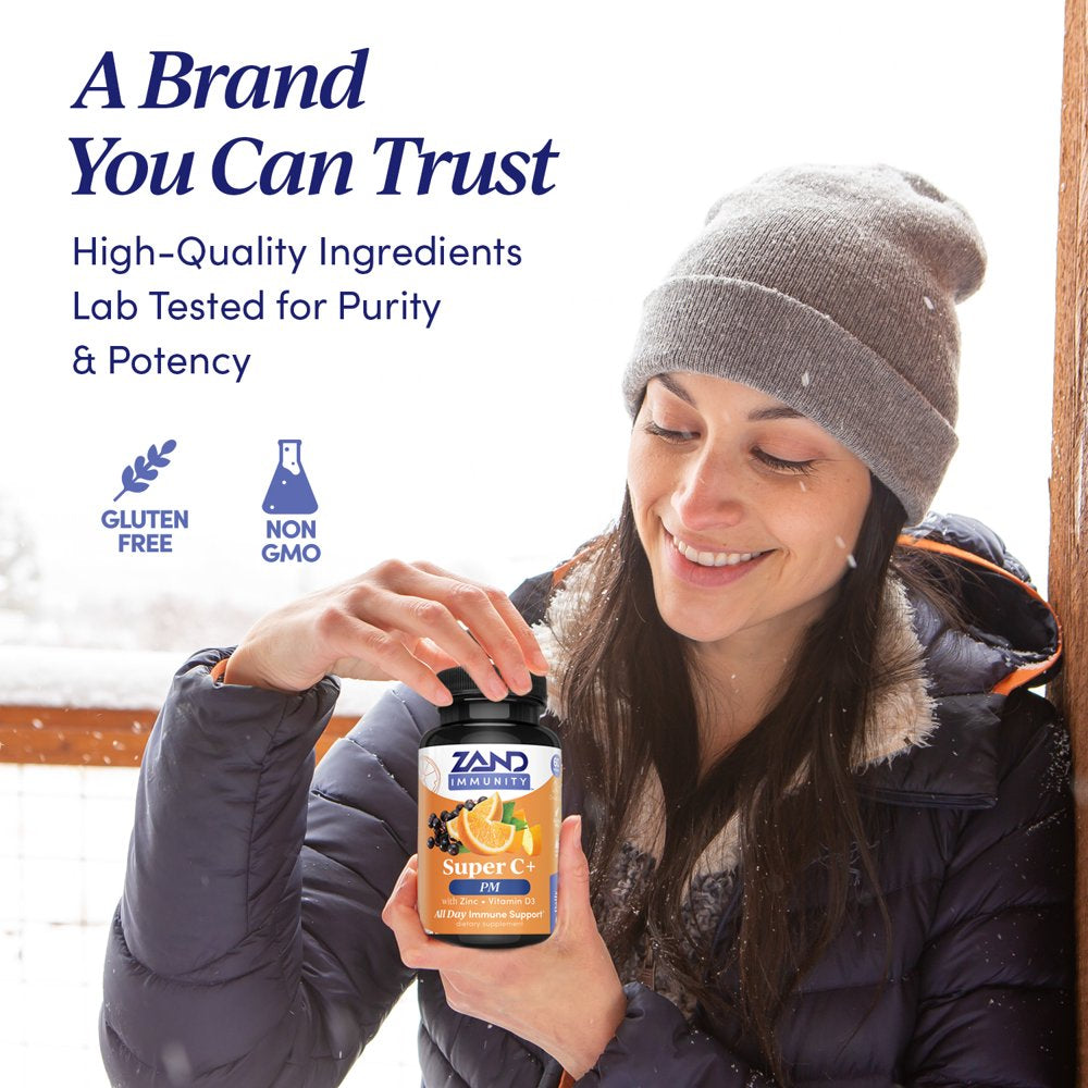 Whether you’re on the road, facing those cold winter nights, or just feeling physically or mentally run down, Zand Immunity Super C+ PM is designed for powerful nighttime support to keep your system feeling strong while helping you get some much-needed rest.