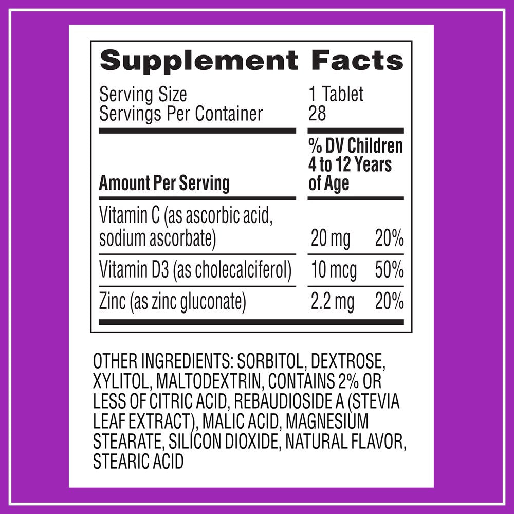 Vitamin C (as ascorbic acid, sodium ascorbate),Vitamin D3 (as cholecalciferol) , Zinc (as zinc gluconate),SORBITOL, DEXTROSE,XYLITOL, MALTODEXTRIN, CONTAINS 2% ORLESS OF CITRIC ACID, REBAUDIOSIDE A (STEVIALEAF EXTRACT , MALIC ACID, MAGNESIUMSTEARATE, SIL CON DIOXIDE, NATURAL FLAVOR,STEARIC ACID/div>