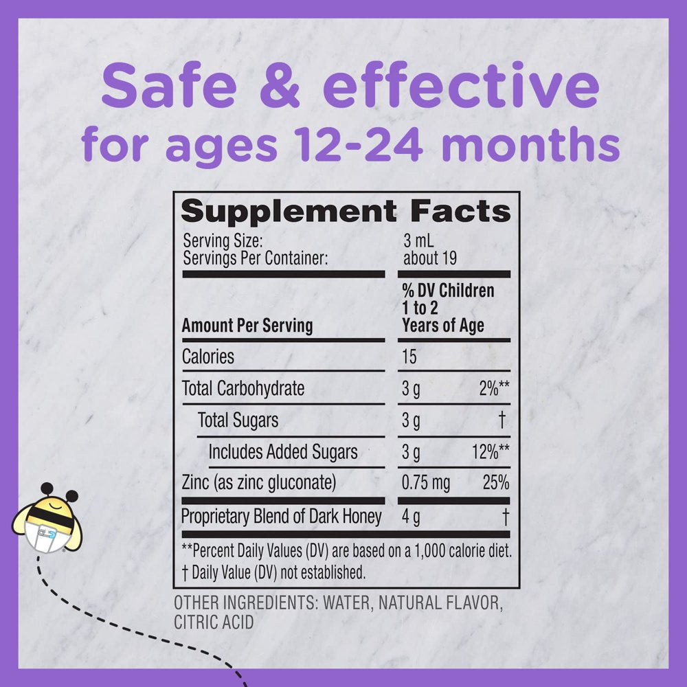 From the makers of the #1 pediatrician recommended cough syrup brand for babies and children under 10 years, Zarbee's Naturals Baby Cough Syrup + Immune with Dark Honey + Zinc gently calms & comforts baby's dry throat*. Made with a special blend of dark honey to soothe coughs associated with hoarseness, dry throat & irritants* and zinc to support the immune system*. This cough syrup is made without drugs, alcohol, artificial sweeteners, artificial flavors, dyes, or gluten.