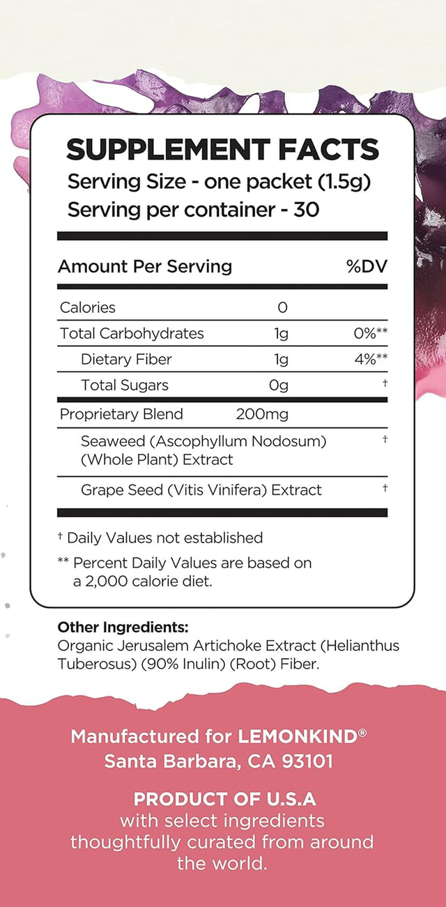 - ZERO Calories per serving and naturally Caffeine-Free. Proprietary Blend: Organic Jerusalem Artichoke Extract Fiber, Seaweed Extract, Grape Seeds Extract.